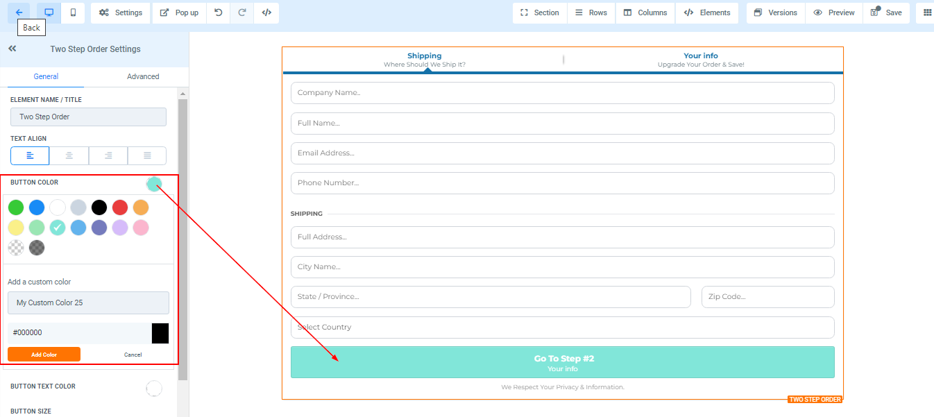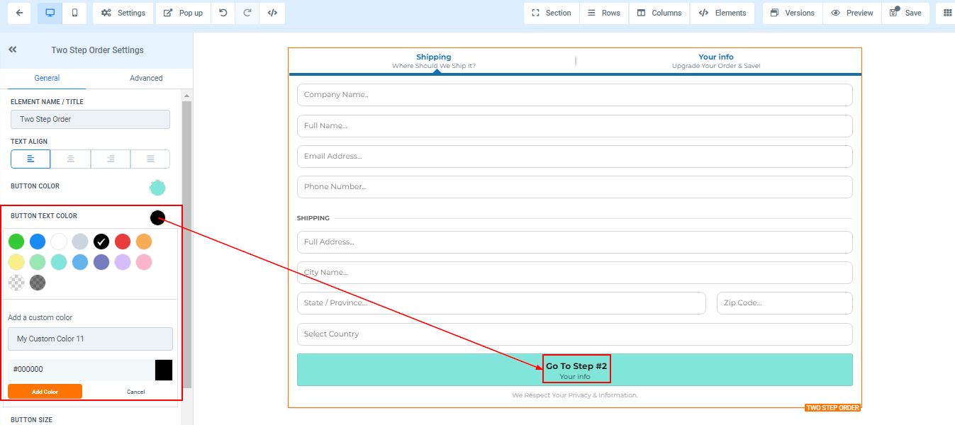 If you want to change the button text color of your order form, you can do that by clicking on the color you want to change it to.