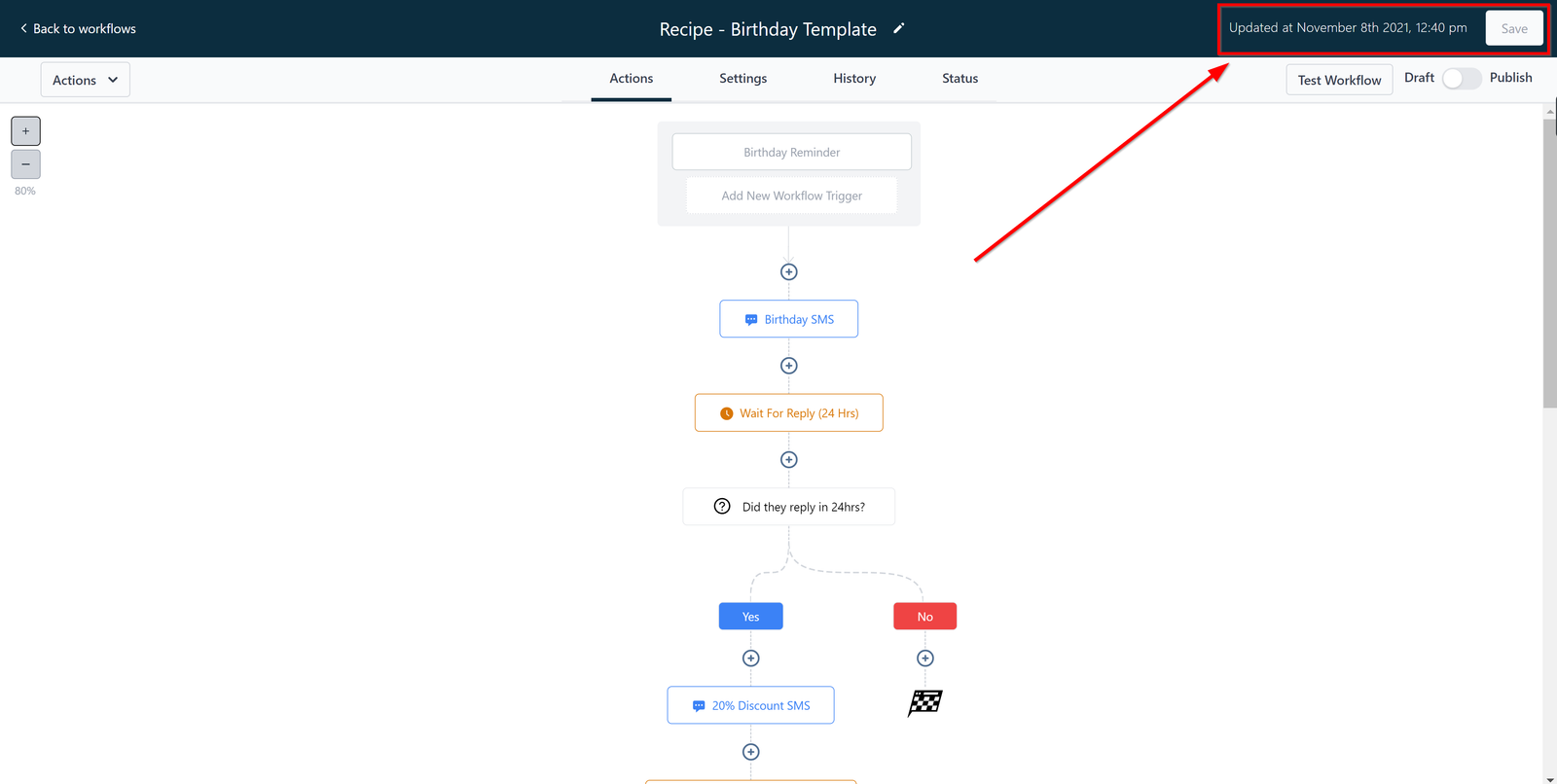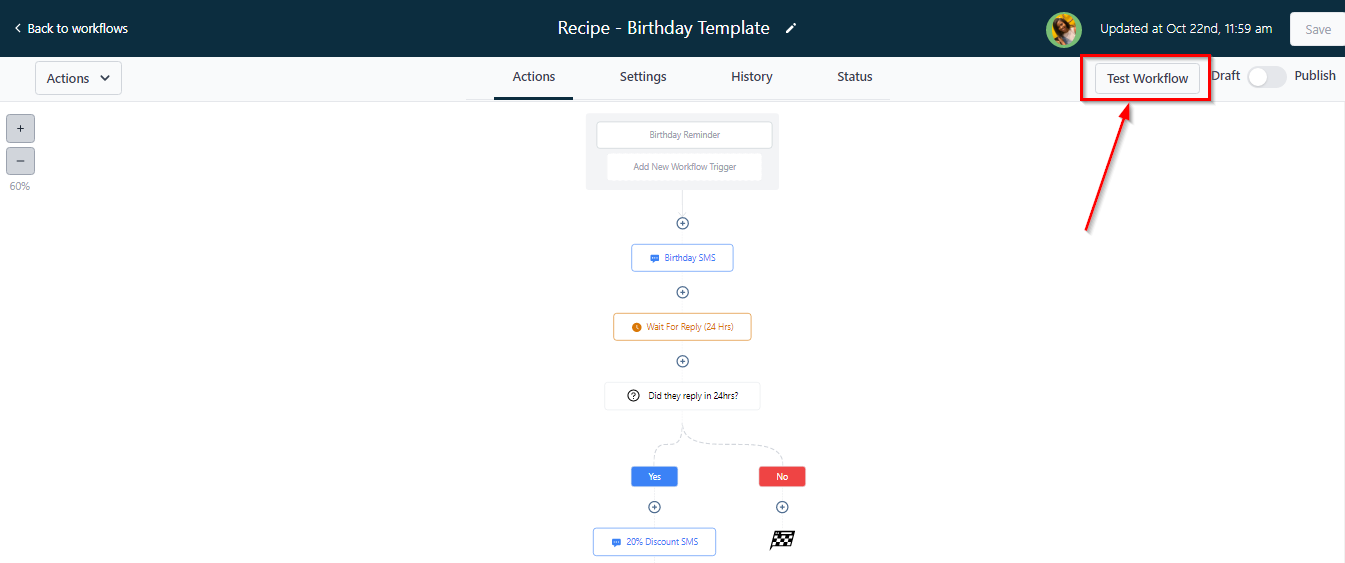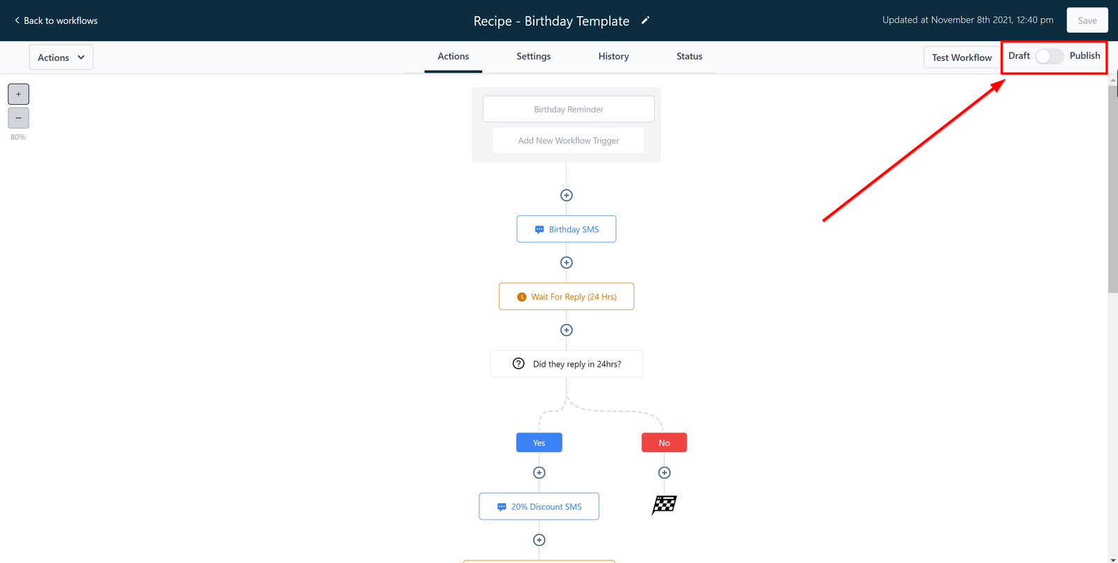 Once a workflow is created, it can either be in draft or publish mode. You can toggle this button to activate/deactivate it.