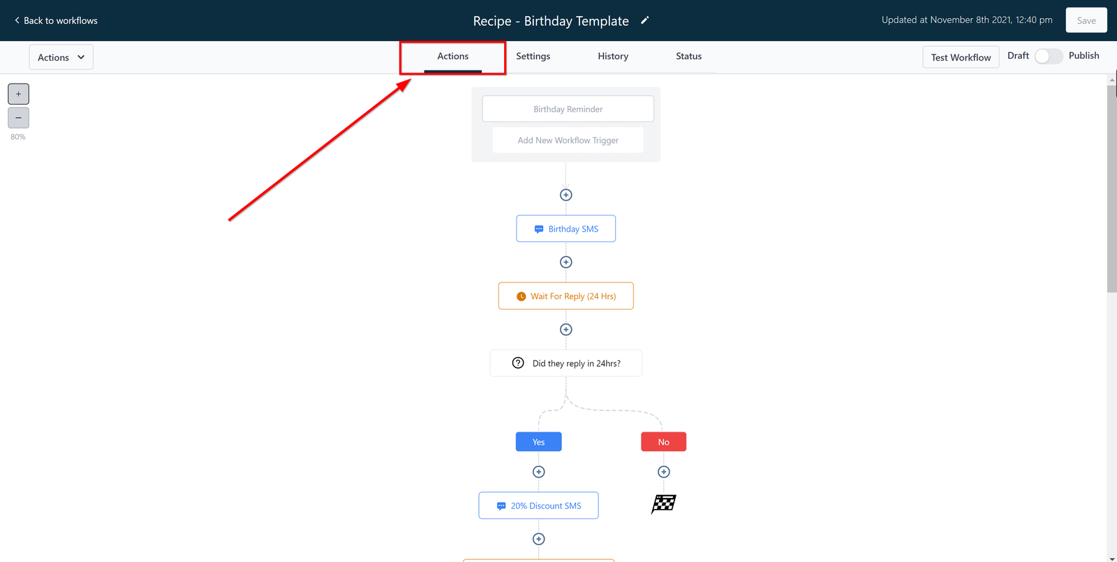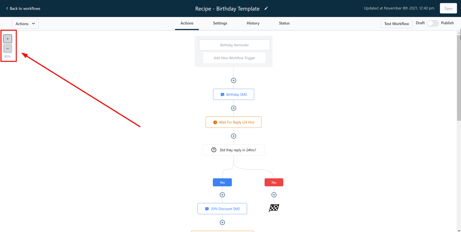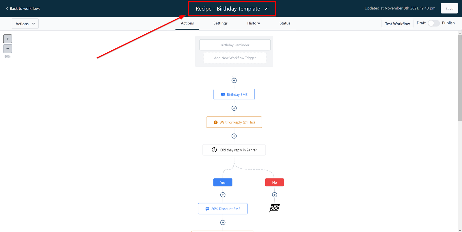 Once a workflow is created, it can either be in draft or publish mode. You can toggle this button to activate/deactivate it.