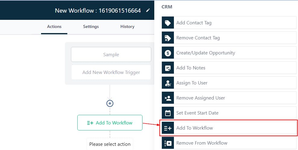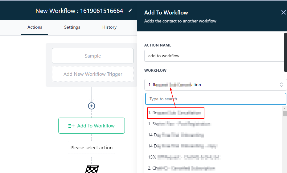 Select another workflow you want to add the contact to. You can add the contact to any workflow, and even duplicate this step to add the contact to multiple workflows.