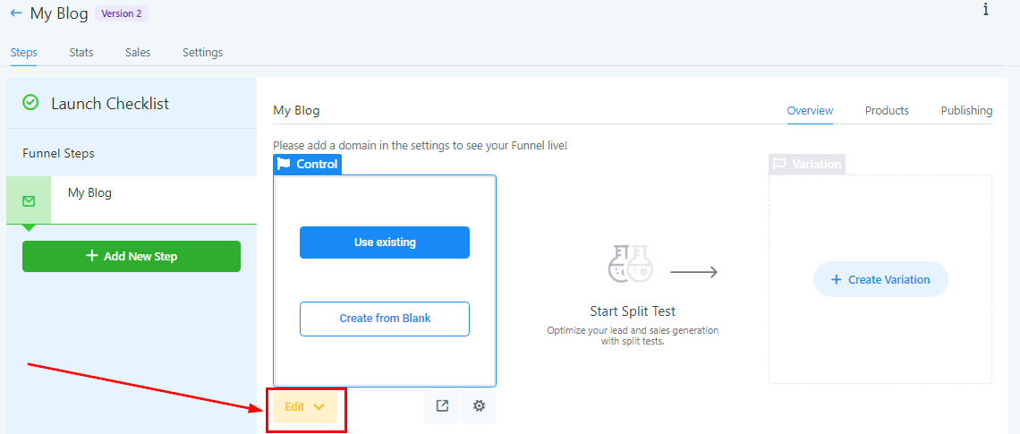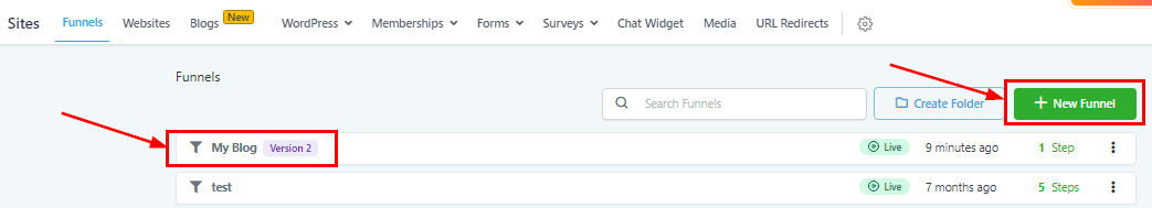 Under your “Sites” section, go to “Funnels” and click on the “+ New Funnel” button as shown below. You can also click on an existing funnel and add a new step or page.