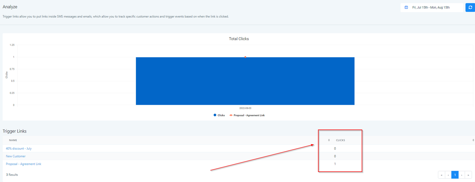 Here you will see the number of Clicks for each trigger link created in the CRM.