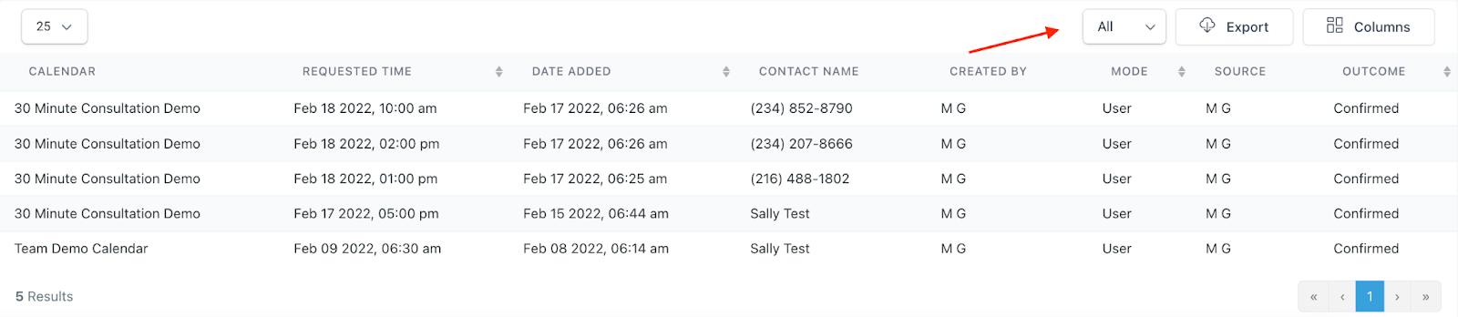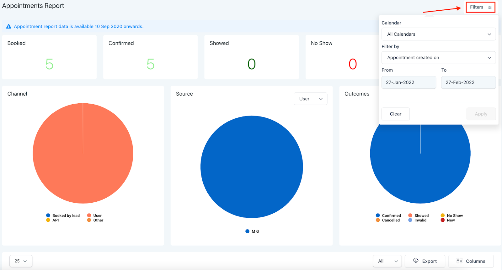 - Select your desired filters for a specific calendar, appointment created on/booked for, and timeframe.