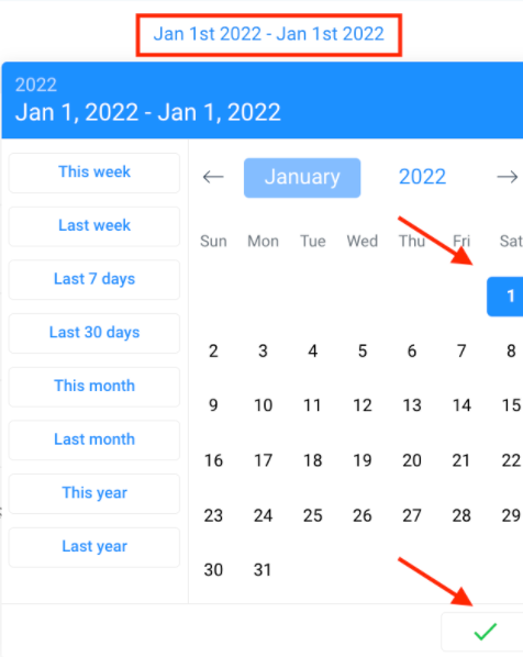 NOTE: If you wish to view reporting metrics for one single day, be sure to check that date as the start and and end date. You must have both selected in order for the stats to appear. The example below shows how you can run reporting for January 1, 2022 by choosing January 1st as the start and end date: