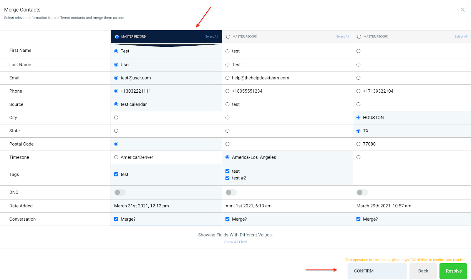 • This will open a pop-up for you to select what information to maintain and overwrite between the contacts. The “Master Record” will be the maintained, default record.