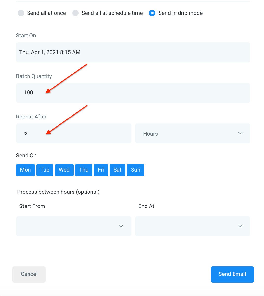 NOTE: When scheduling a bulk action in drip mode, the “repeat after” does not repeat the entire process. Instead, it can be viewed as “run every”. As shown in the example below, 100 contacts would be processed per every 5 hours. This process would repeat until all selected contacts received the drip communication. (If you had 780 contacts selected, there would be a total of 8 batches – 7 x 100 and 1 x 80).