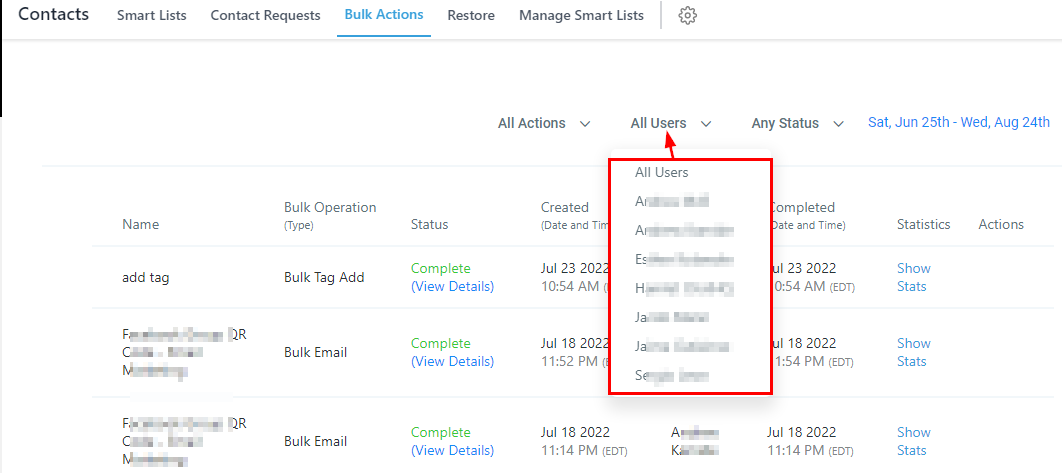 You can also filter by users. When selecting a user, the table will show all bulk actions performed by that user during a selected date range.