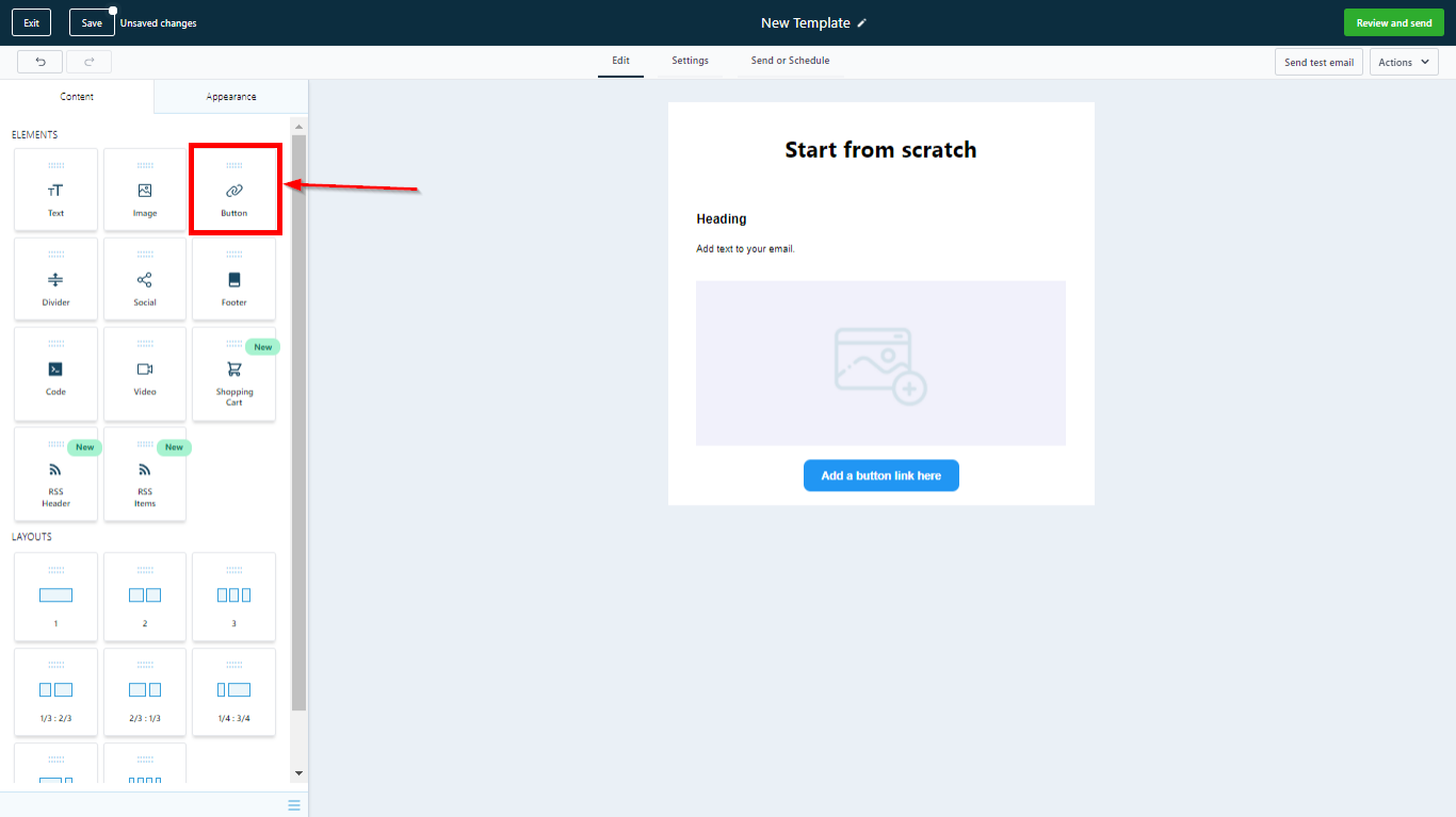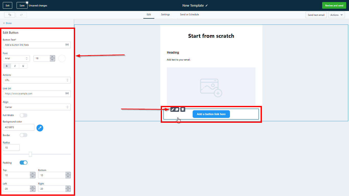 You can also access the button settings by clicking the pencil icon in the Button element of your email builder as shown below.