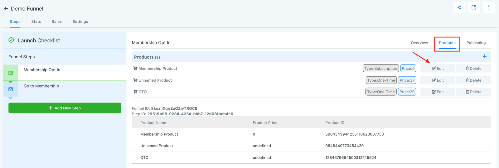 - Click “Edit” to update an existing product, or you can click the + to add a new one.