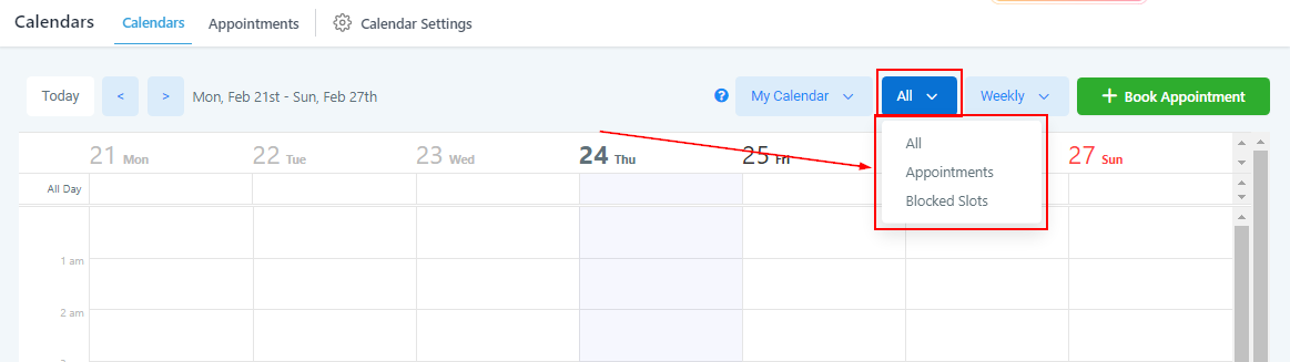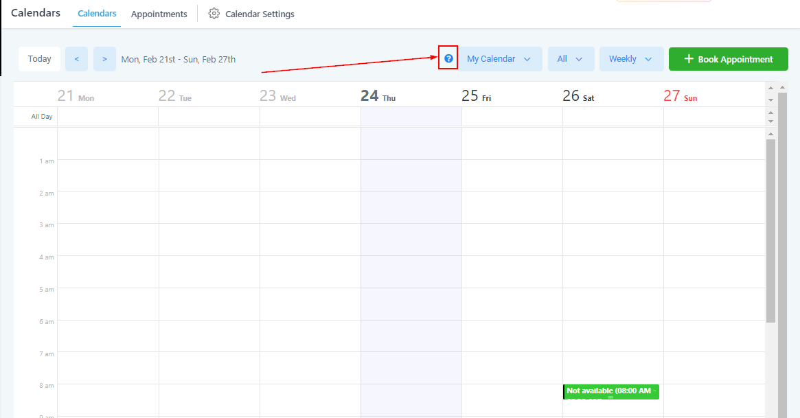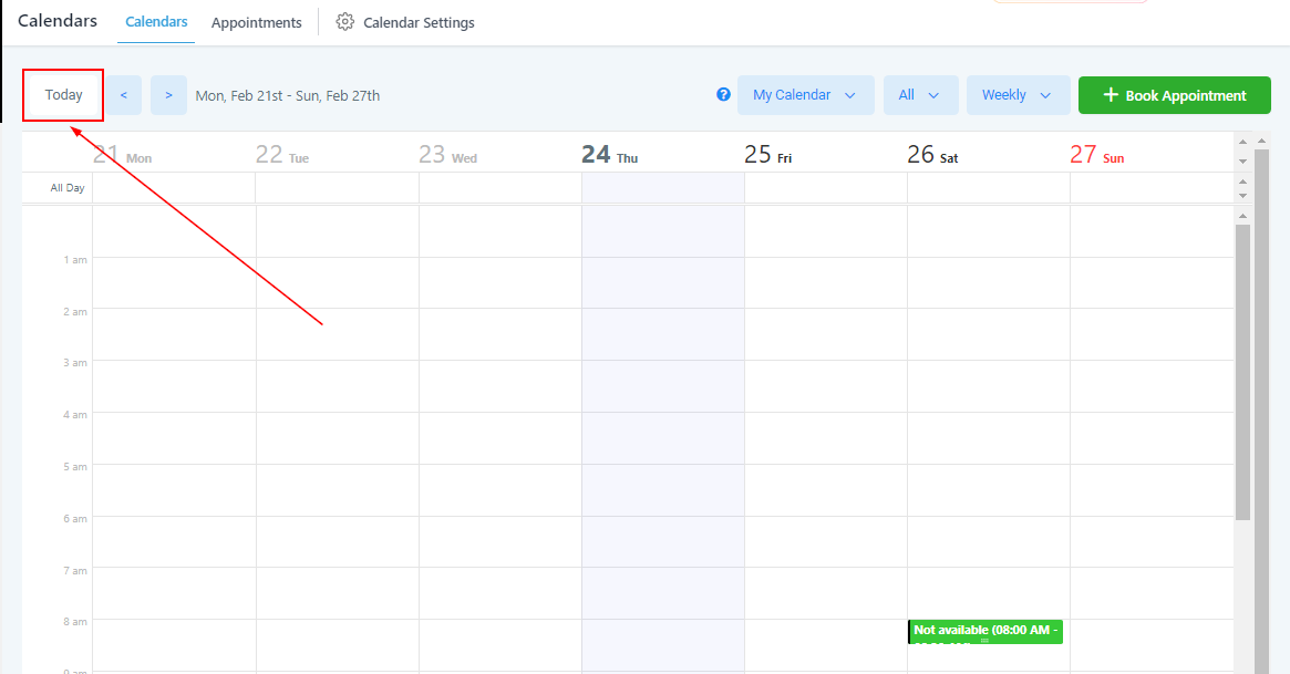 You can change the date range of your calendar in order to see scheduled appointments for the month, week, or day.