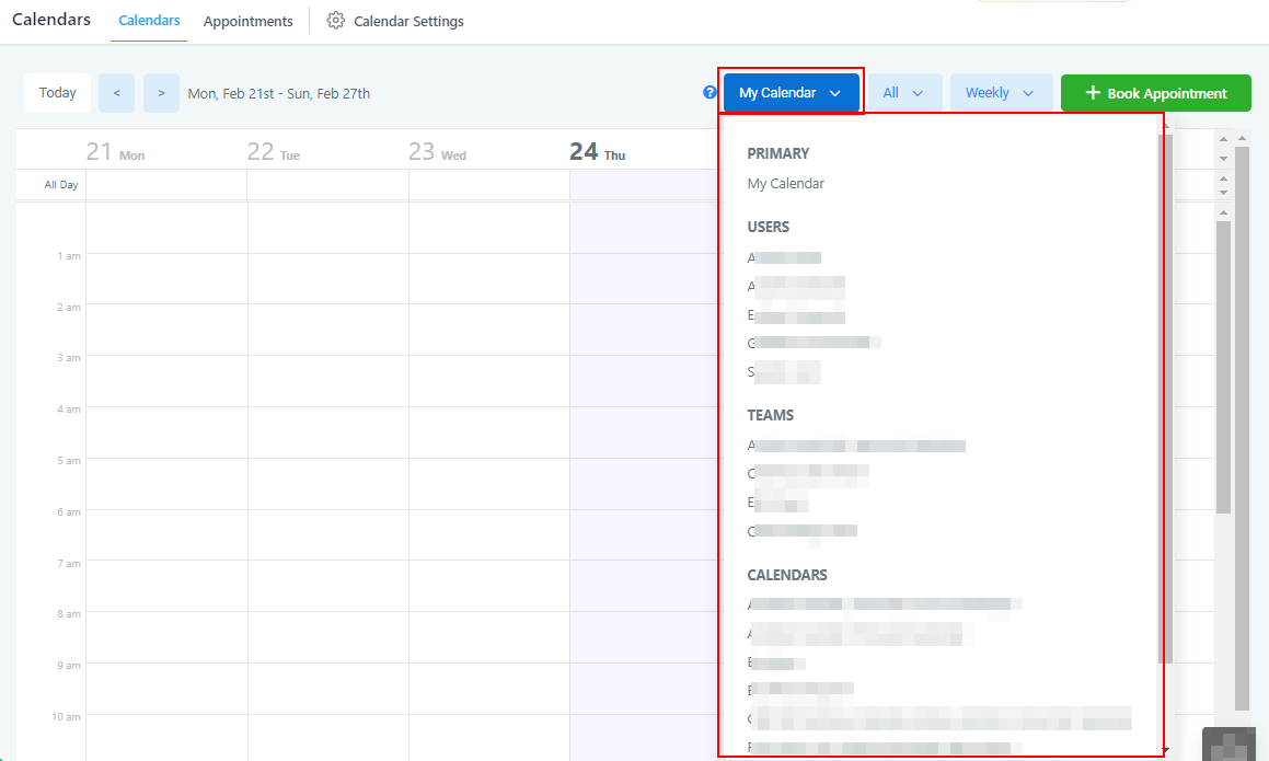 If you have multiple calendars connected to your CRM, or if you’ve created multiple calendars, you can filter which calendar you want to look at by using this drop-down tab.