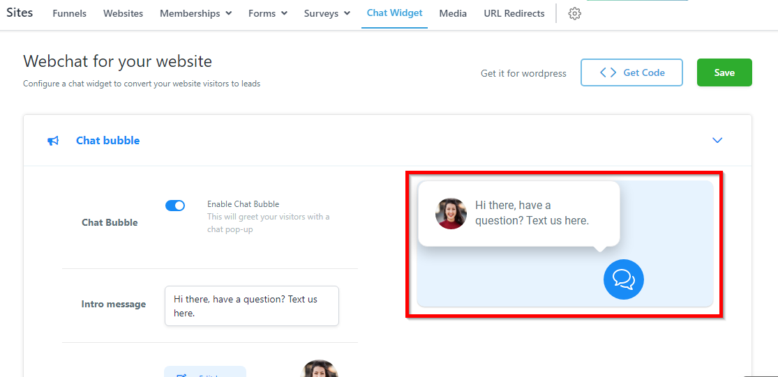 This is a preview of what your website chat widget bubble will look like. As you customize your chat widget, you can see the changes happening in real-time here as a Preview.