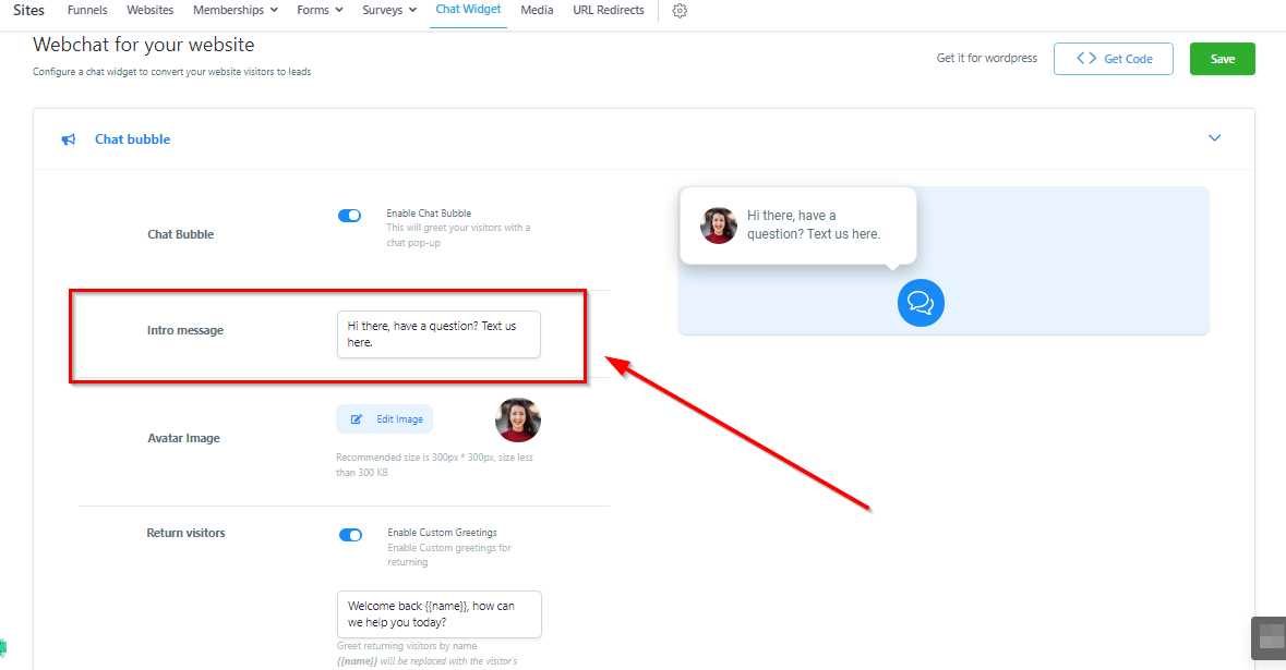 This controls the welcome message your new website visitor sees. The text here should either offer support or a marketing communication to get visitors to click on the chat widget.