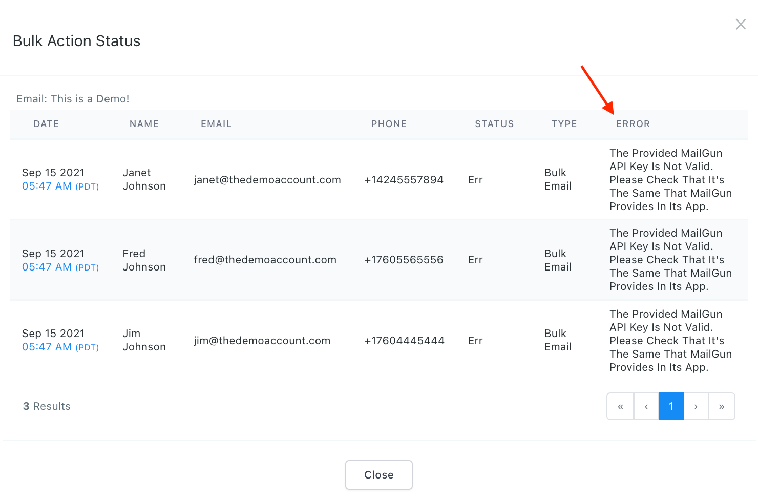 - In the popup that appears, you’ll see which contact record(s) contained an error. You’ll also see a description of the error that occurred.
