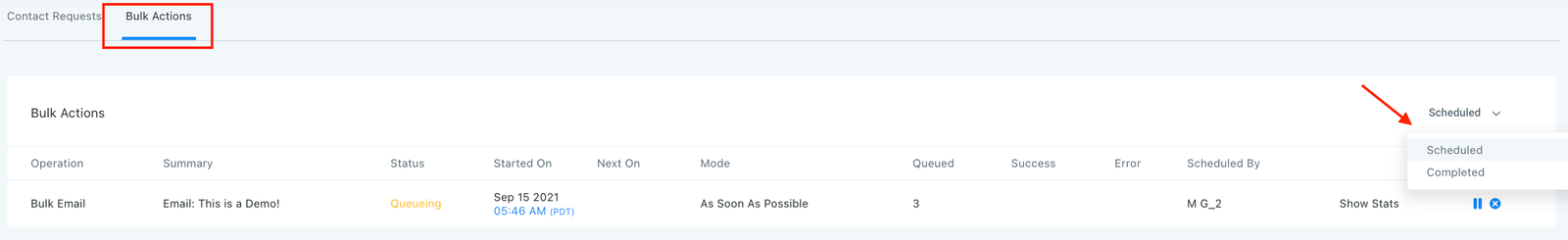 - You’ll be redirected to the Bulk Actions page, where you can toggle between “Scheduled” and “Completed”, depending on how you scheduled your email deliverability.