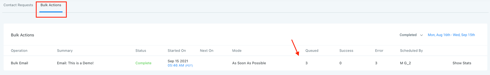 - On the “Scheduled” or “Completed” page, you’ll see columns for Queued, Success, and Error. You can click any numbers that appear under those columns as hyperlinks, or the “Show Stats” button to view stats.