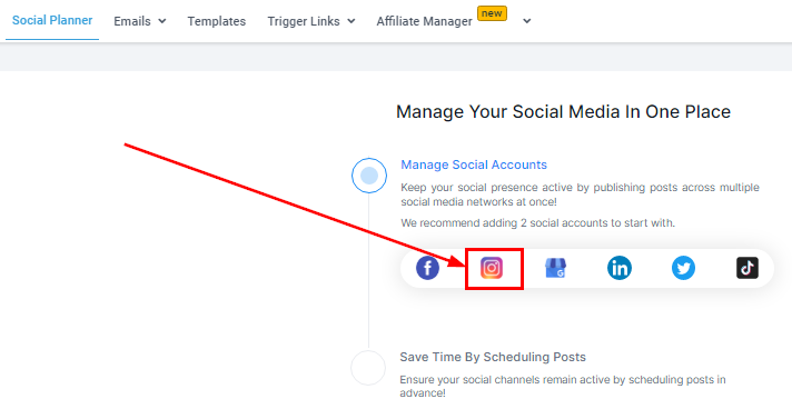 If you don’t have any social media account connected yet, click on the Instagram icon in the wizard with connect option as shown below to start setup.