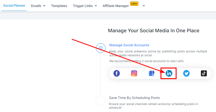 If you don’t have any social media account connected yet, click on the LinkedIn icon in the wizard with connect option as shown below to start setup.