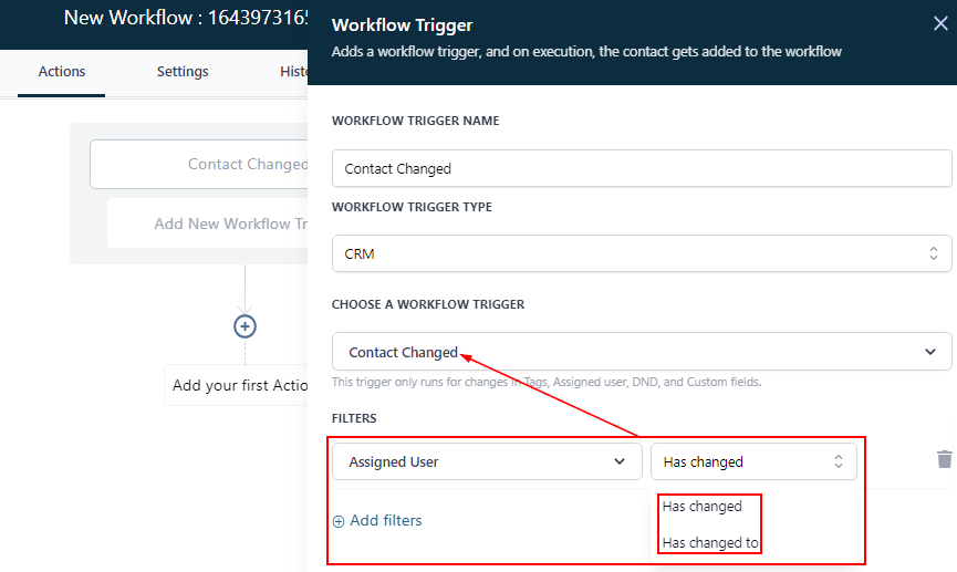 When you select the “Has changed to” filter, this workflow will ONLY run when the specified user is assigned to a contact. For example, if the previously assigned user was Jim, you can add the user John to this filter, and ONLY run this workflow when John is assigned to a contact.