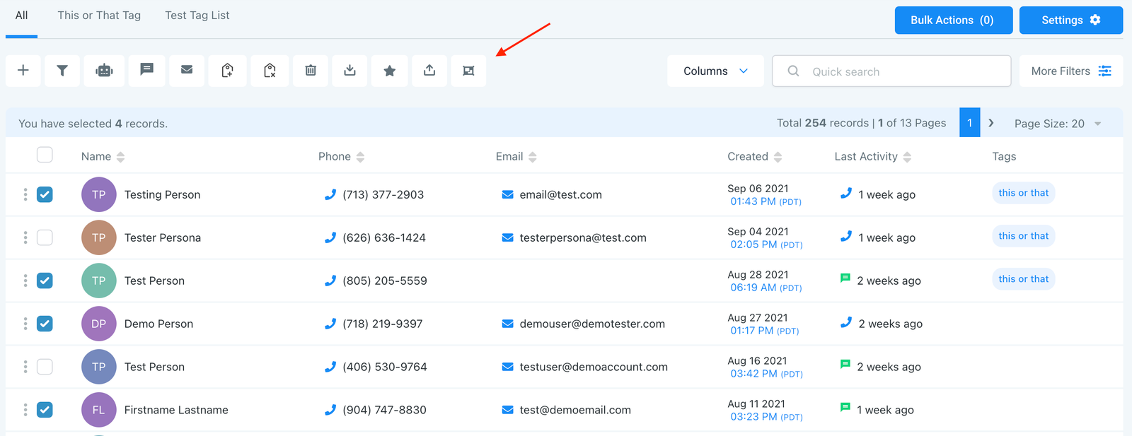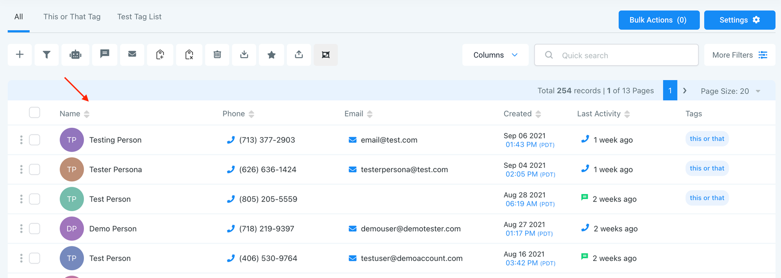 • The main page displays a list of all your contacts and basic information like name, phone number, email, when they were created, last activity, and tags.