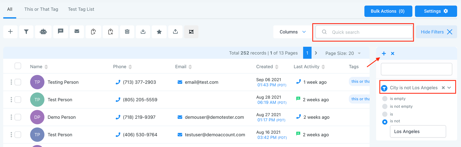 • You can also use the Quick Search feature to do a quick search by name, email, business name, tag, or phone number.