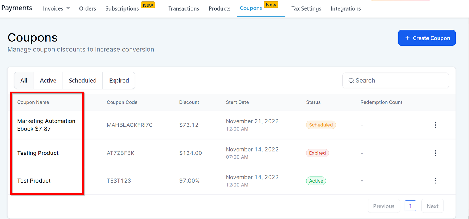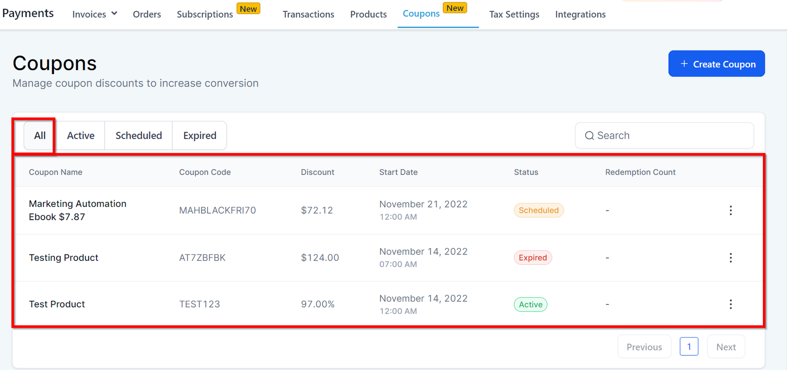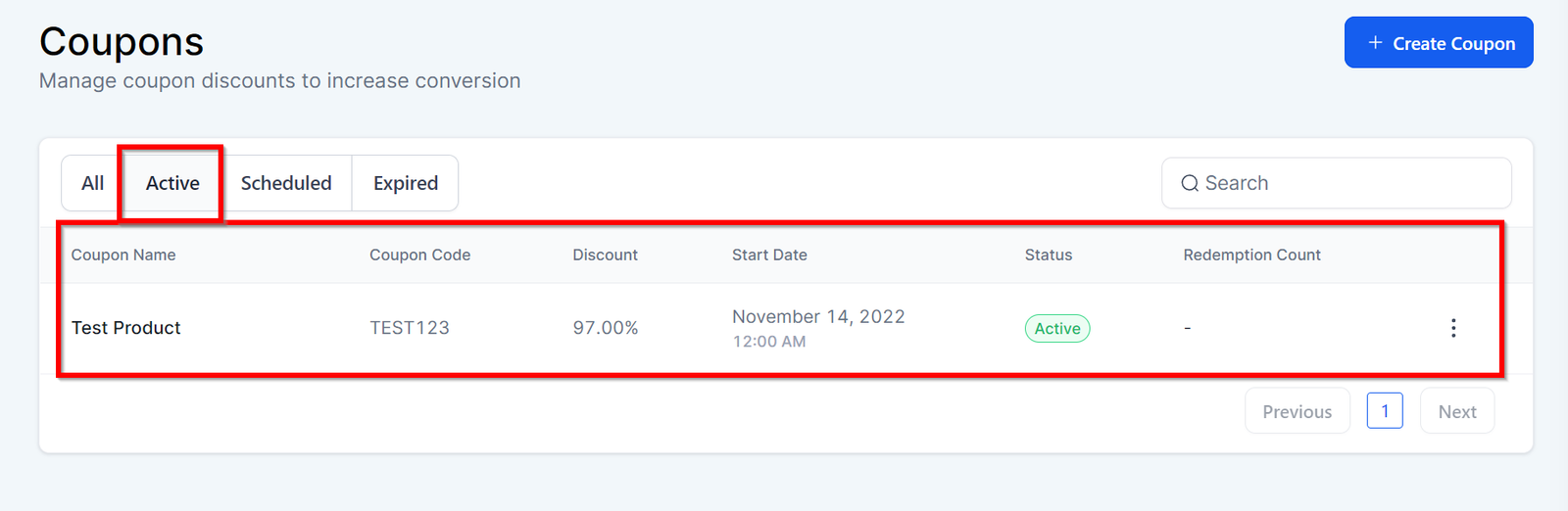 Let’s you view coupons that are active at present. Helpful when you have bunch of offers in your CRM and you need to view only the coupons that are active and running.