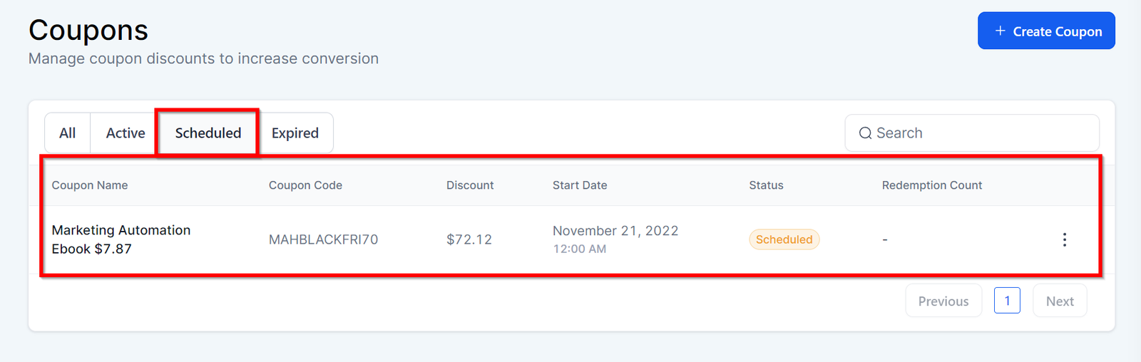Let’s you view coupons that are scheduled for a specific duration. Helpful when you have bunch of offers in your CRM and you need to view only the coupons that are scheduled for later.
