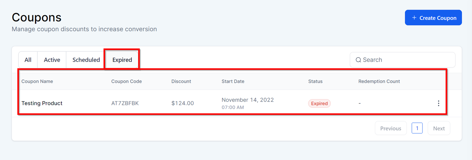 Let’s you view coupons that are expired. Coupons are basically offers valid for a certain period. after the offer period, the respective coupon will move to expired status.