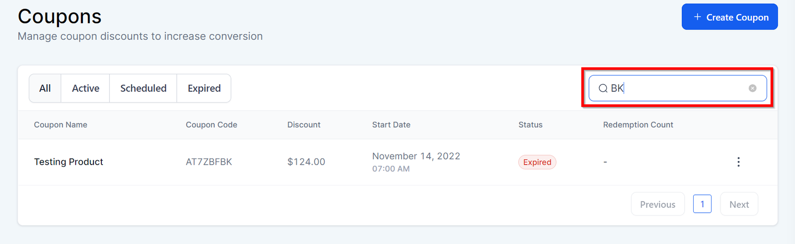 Let’s you search for a coupon by entering a coupon code. You can only search a coupon if you know some part of a coupon code.