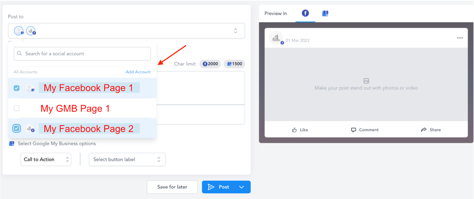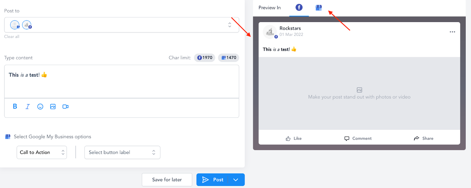 - If you are posting to more than one social media platform (i.e. Facebook and Google My Business, you can toggle between previews at the top.)