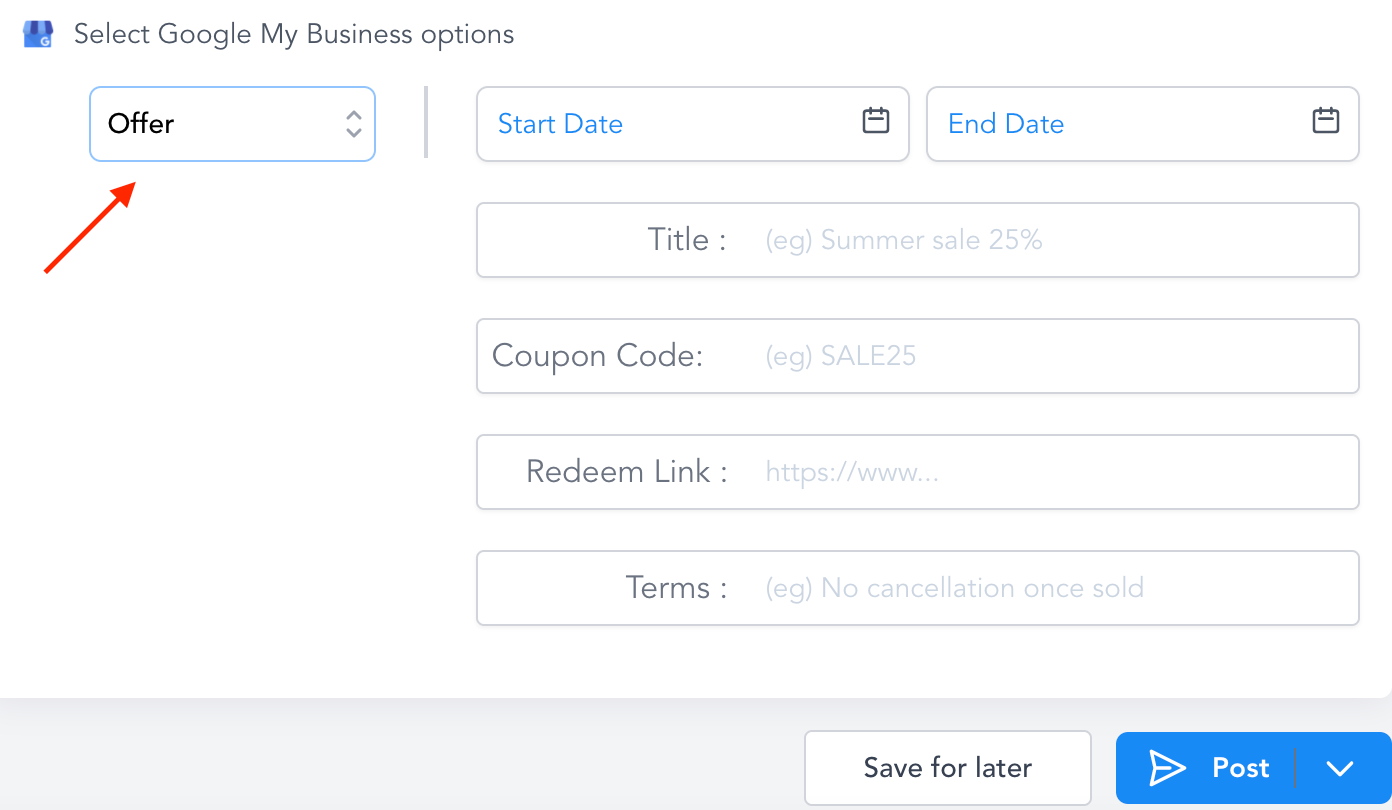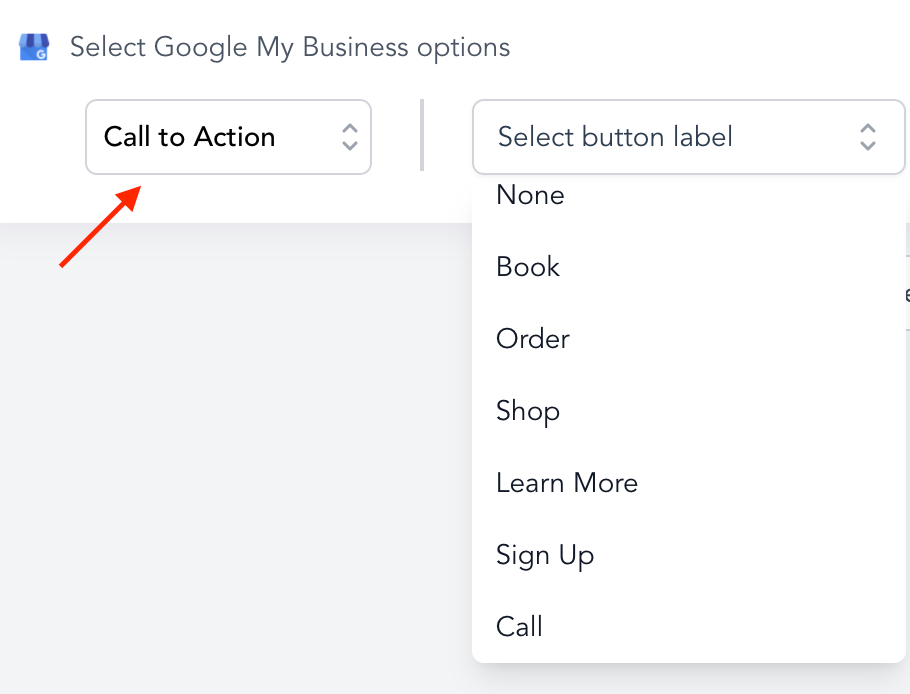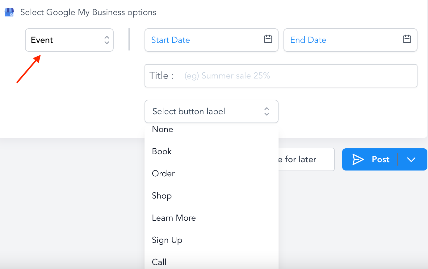 - If you are posting to Google My Business, you can choose from various options. Be sure to fill out all the appropriate information from the option you choose in the dropdown list.