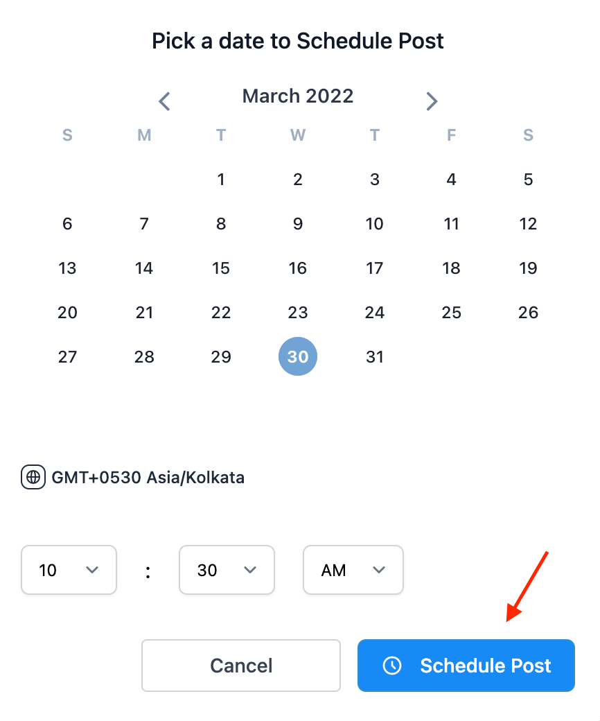 - If you choose to schedule the post, a popup calendar with the date and time will appear. Choose your date and time and click “Schedule Post” to confirm.