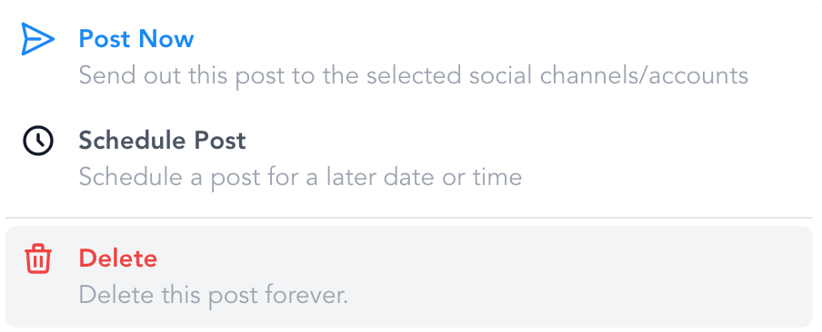 - You can either “post now” to share the content right away, or “save for later” to schedule for a later time. You can also “Delete” the post if you changed your mind and wish to remove the content.