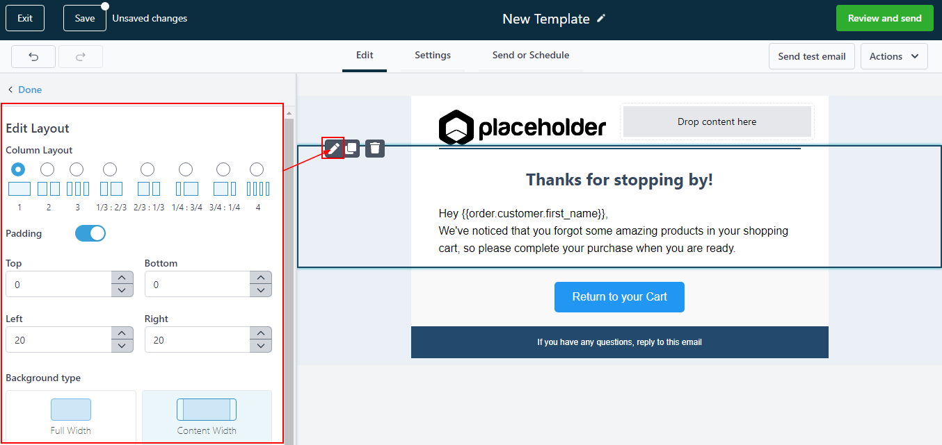 When you are starting from scratch or adding layouts to your templates, the first thing you have to do is grab a layout block and simply drag & drop it into the template workspace.
