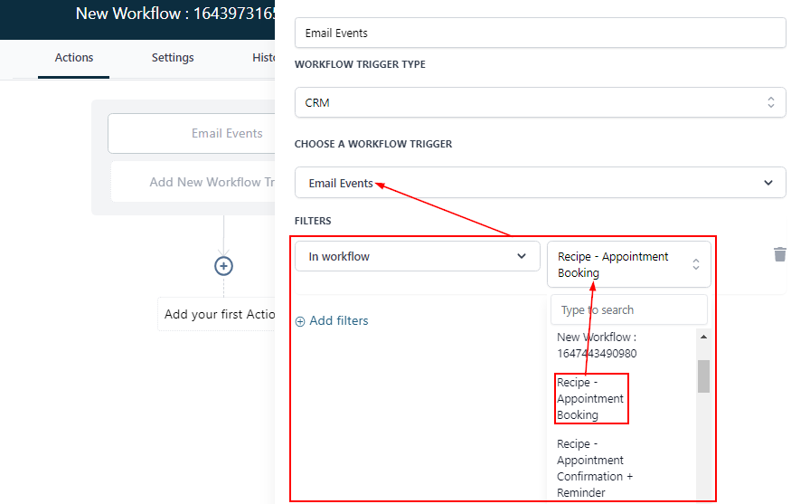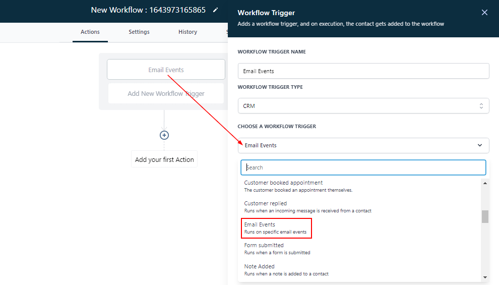 This filter allows you to choose what event you’d be looking to fire the trigger off of from your sent email;
