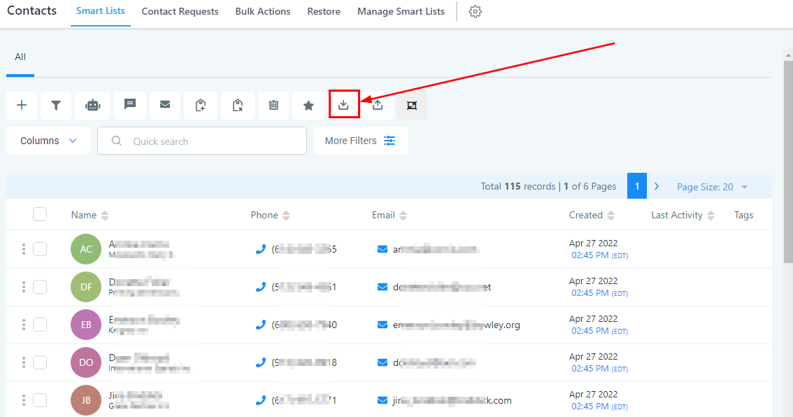 If you need to export a single contact or a group of contacts from your CRM or marketing campaign, click on this button and it downloads to your local device as CSV. spreadsheet.