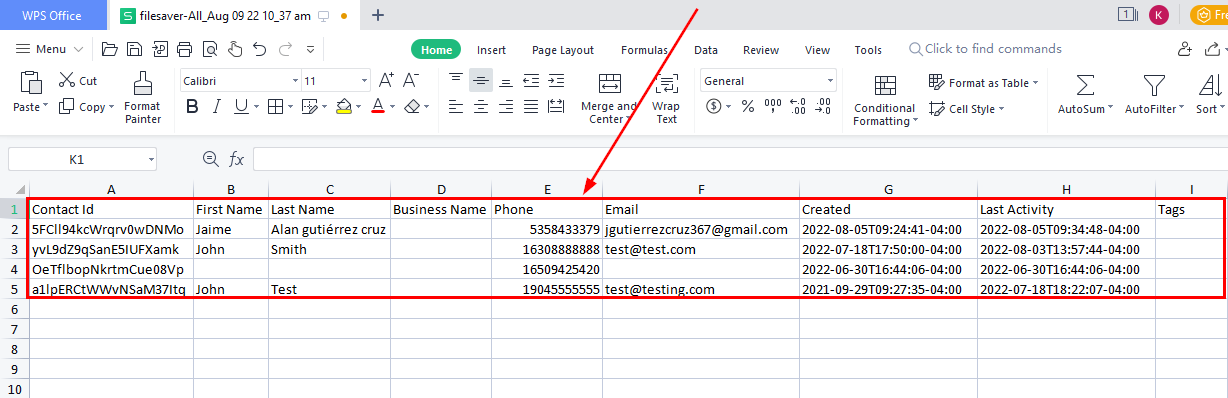 The downloaded spreadsheet consists of these column headers with the contact’s corresponding information;