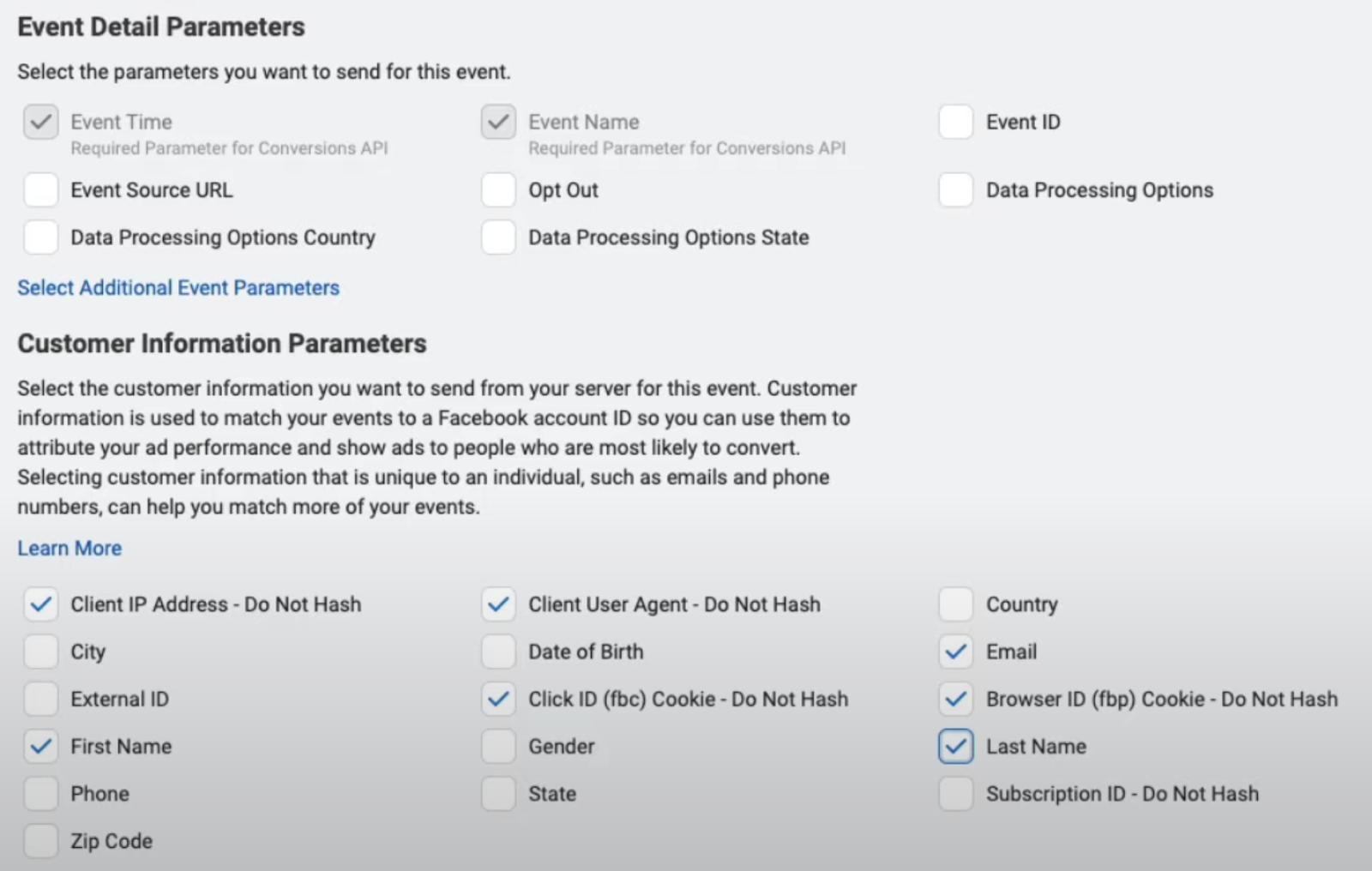 - Under Customer Parameters – select the data that we can send back from our system.