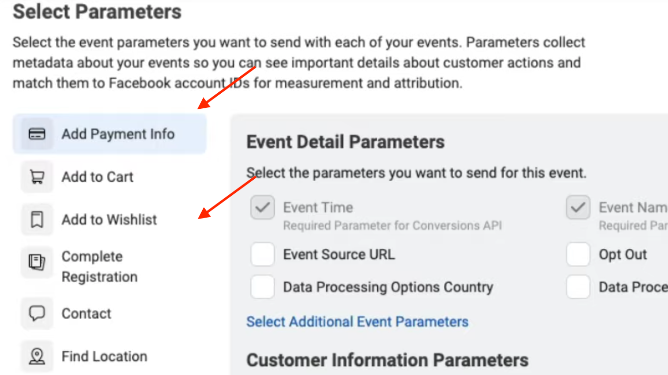 - Repeat the Parameters selection for each event you selected (such as Find Location, Add to Cart, etc.)