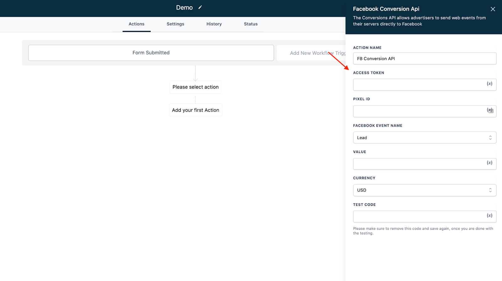 - NOTE: If you wish to run a test, you can copy the Facebook Pixel Test Code from the Settings, paste it here into the “Test Code” field, and then run a test of the workflow. To run the test, the workflow must actually be triggered by an event (like a form submission). The “Test Workflow” button doesn’t allow testing FB conversions with API.