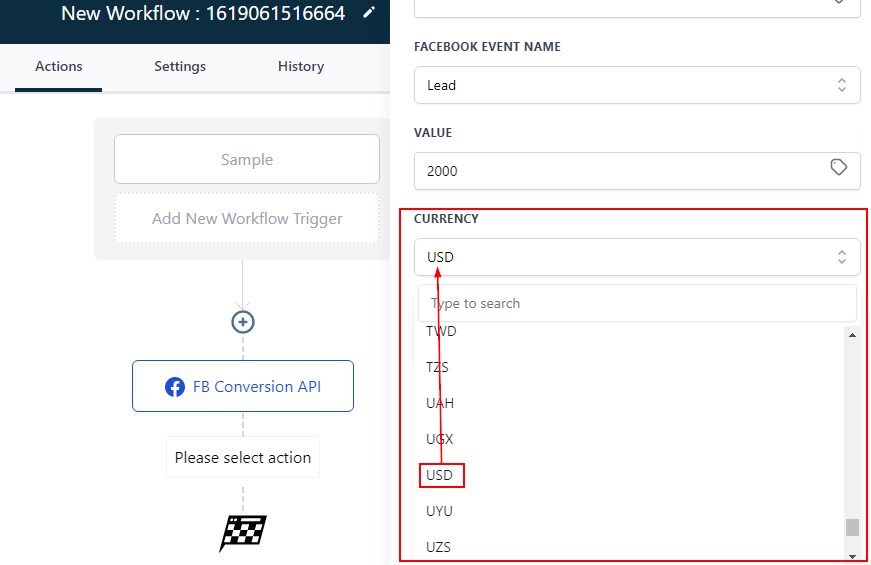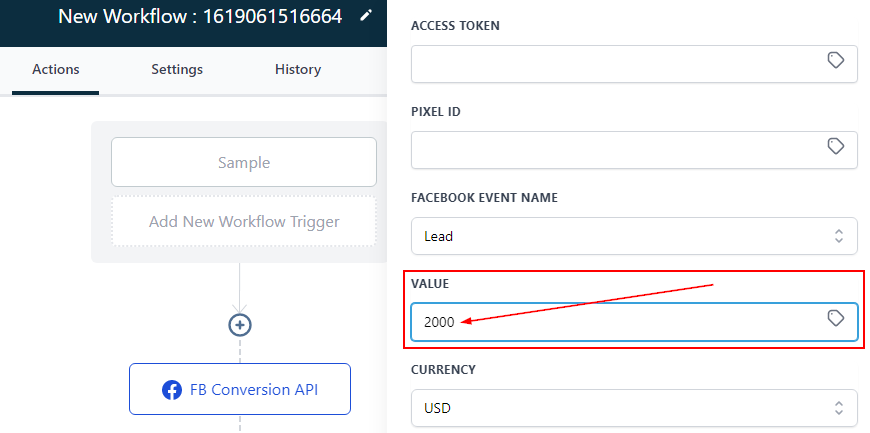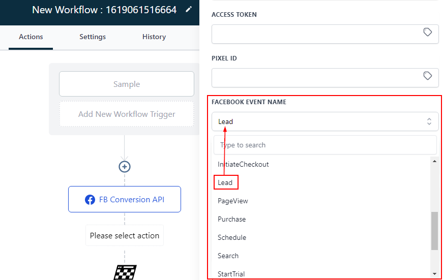 To add an Access token, Goto settings in Facebook business manager, then select “Generate Access Token” in the Conversion API section. Copy and paste it in the ‘Access token’ field in the workflow