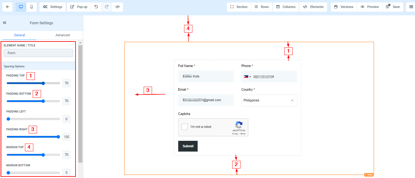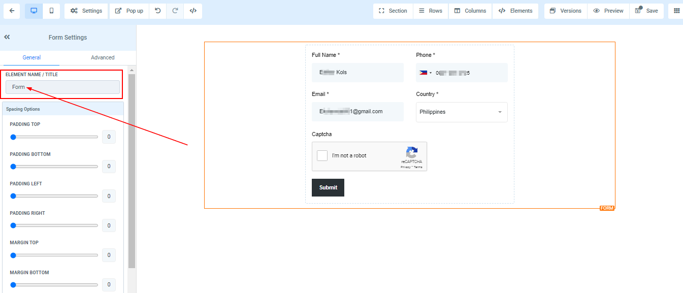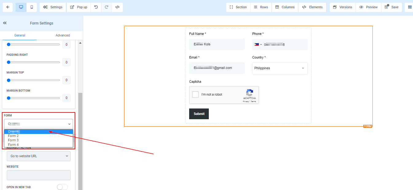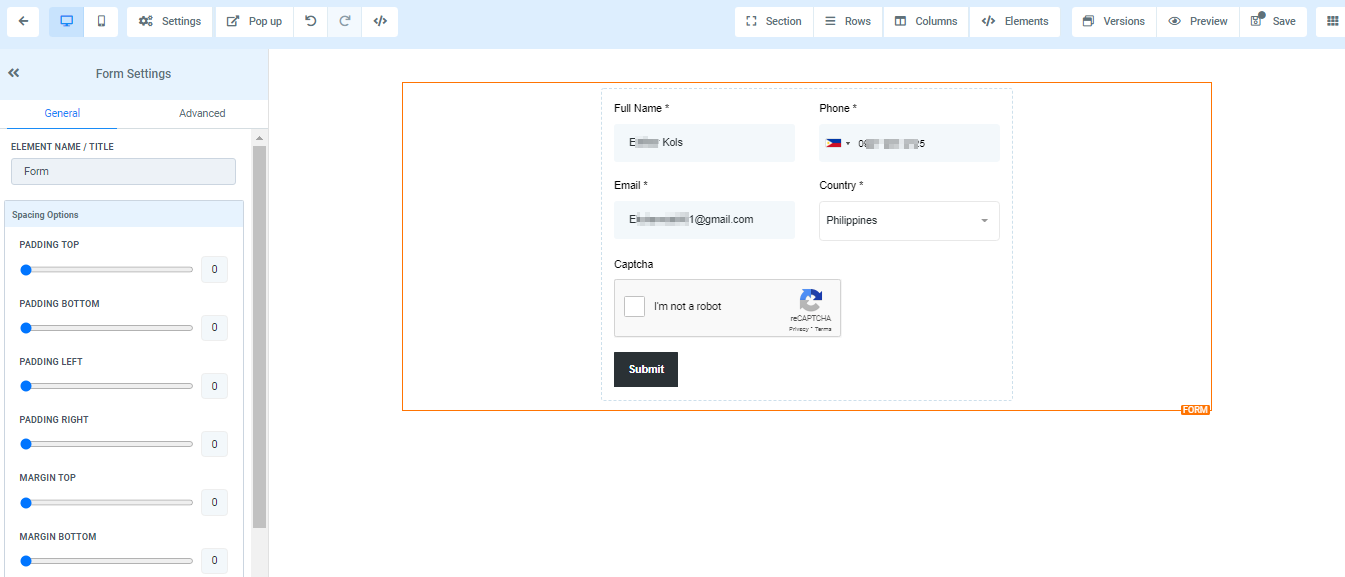 You can incorporate your Form into your page. If you haven’t created one yet, you will be redirected to the Form page to create one. If you already added your form but you updated the form from the Form page, you will have to delete the element and add it again for the update to reflect.