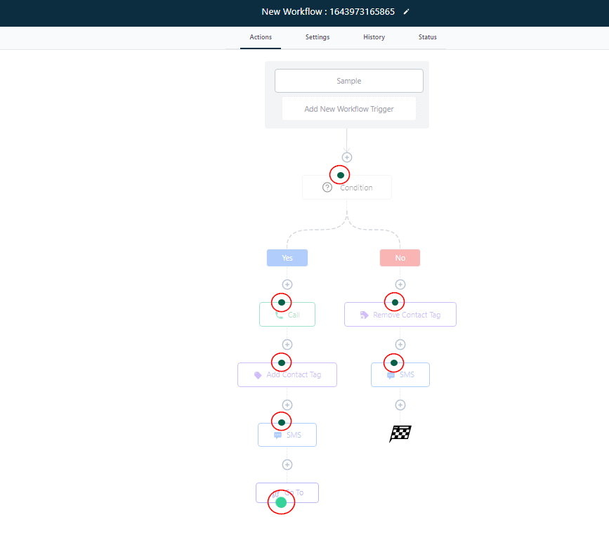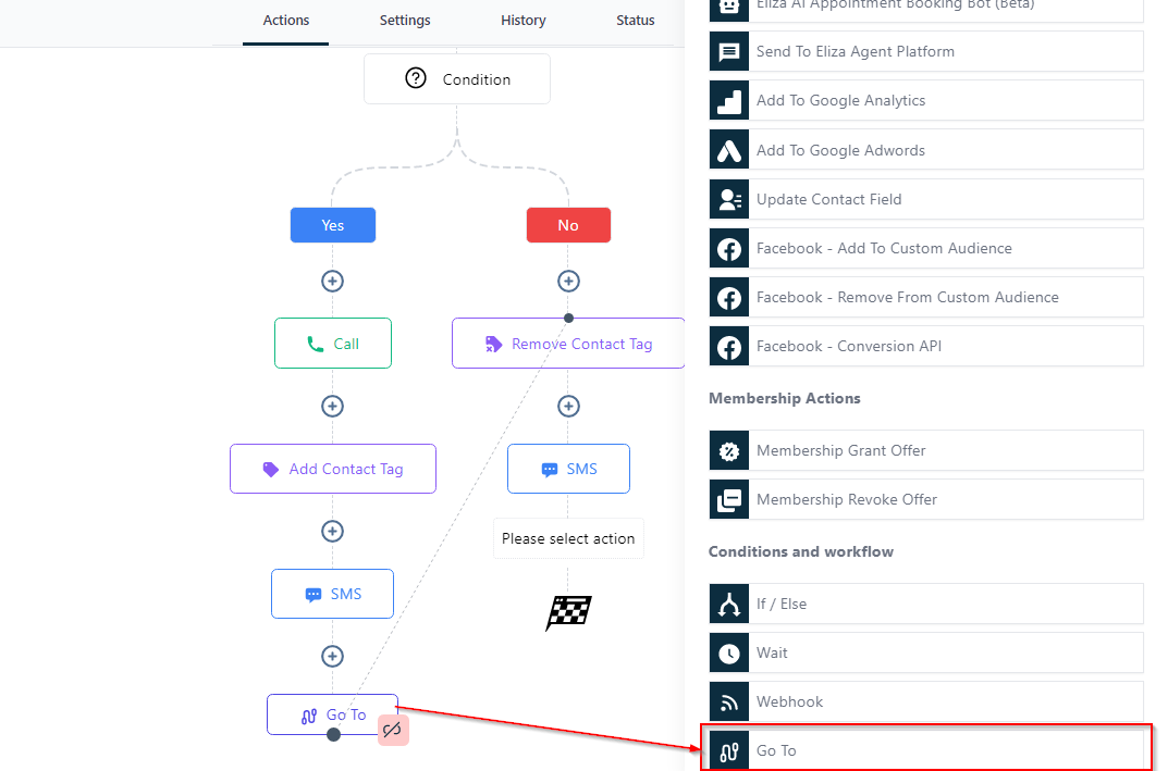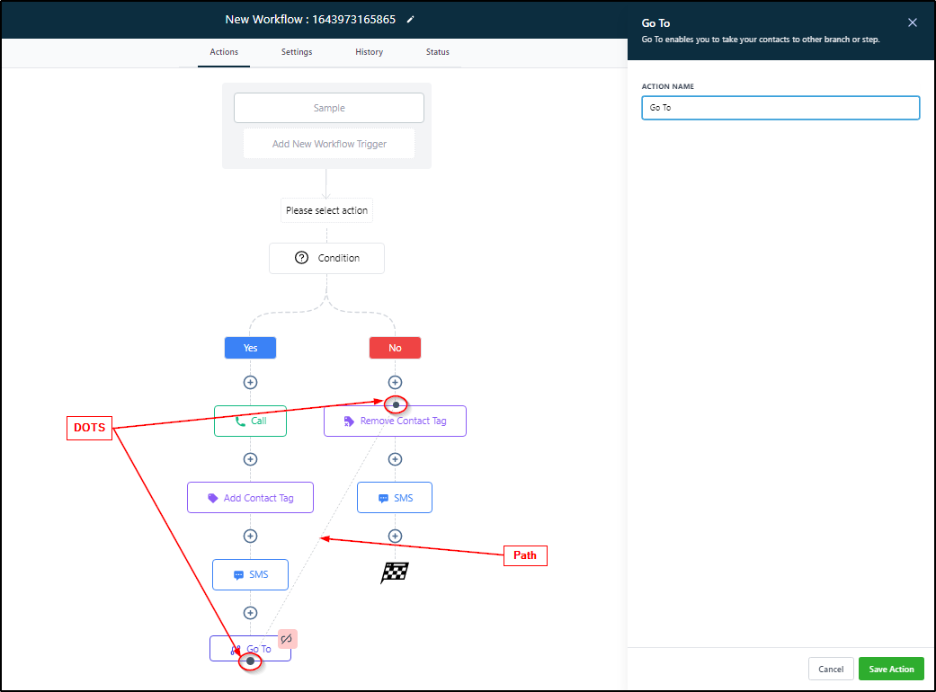 “Go-To” action enables you to jump a contact to another branch or step within a workflow. It can only be at the end of any branch or step, else it won’t allow you to save action.