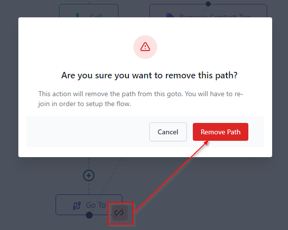 Once a contact hits this GoTo step, they will automatically jump to whatever event you’ve connected with the dotted line. For instance, the image below shows that they will automatically jump to the “Remove contact tag” event.