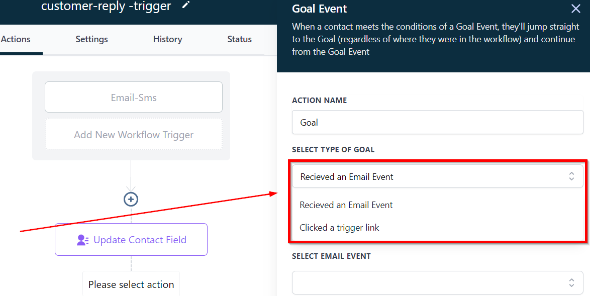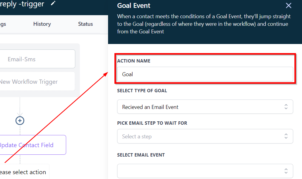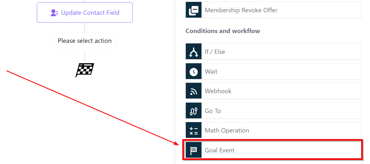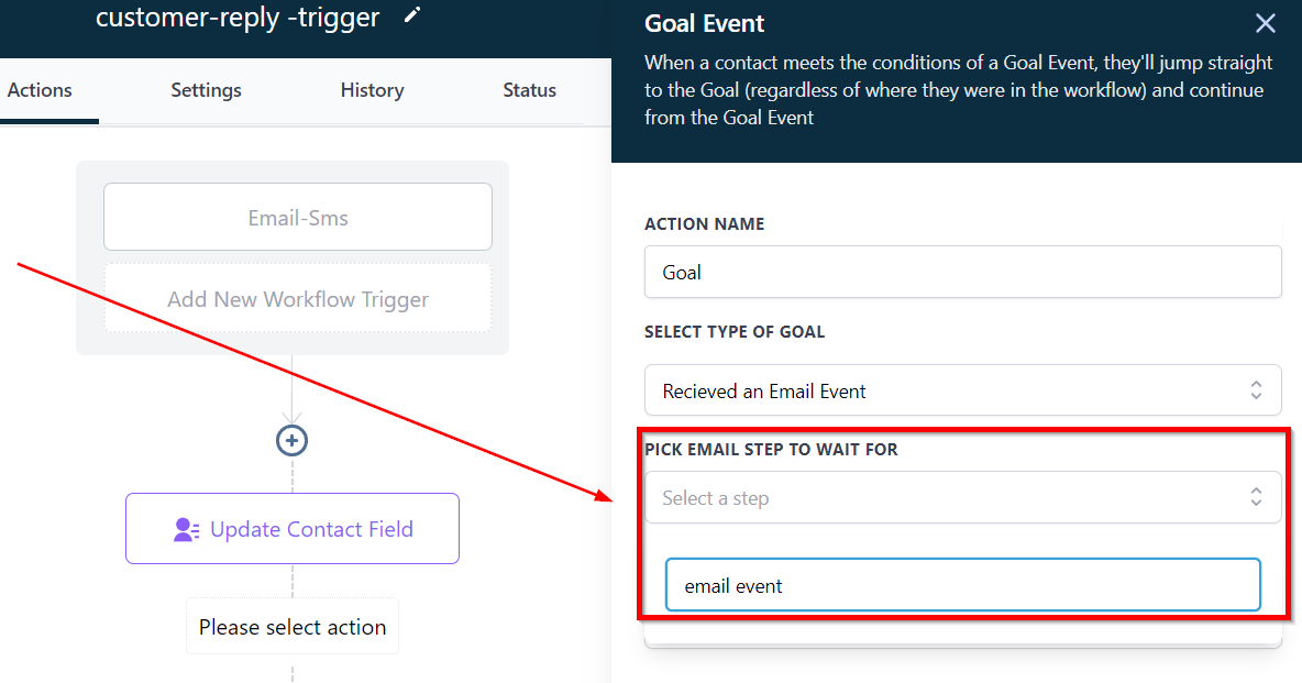 Goal Events allows you to set a contact Goal for a workflow. From the moment a contact enters the workflow, the system will be “listening” for the specified Goal Event to occur regardless of the step the contact is in.