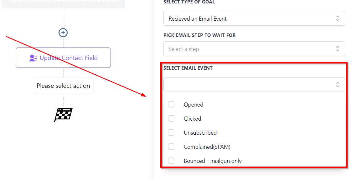 From the options below you can select the email event depending on your objective. From the checkboxes, you can select one or more events as per your goal.
