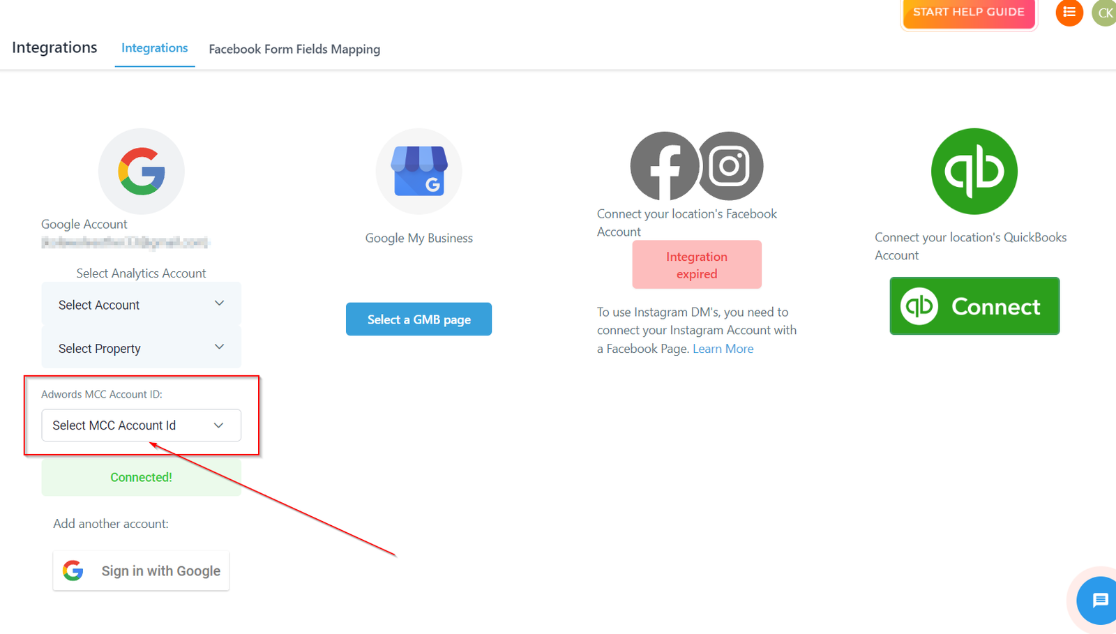 This option will allow you to select the MCC account ID which you want to connect to your CRM location. To confirm your MCC ID, you can log in to your google ads account and find out this information under “Customer ID” menu.