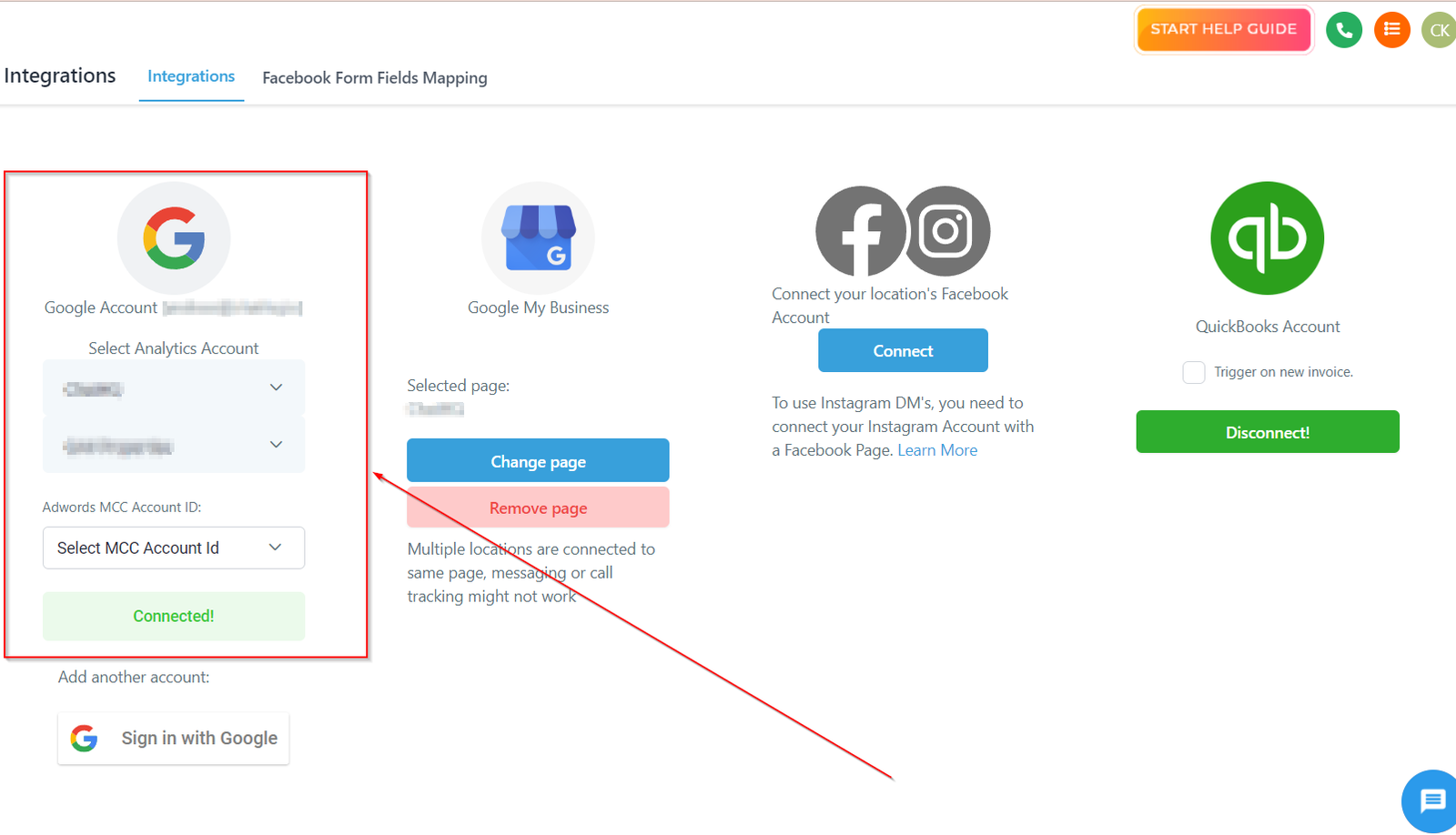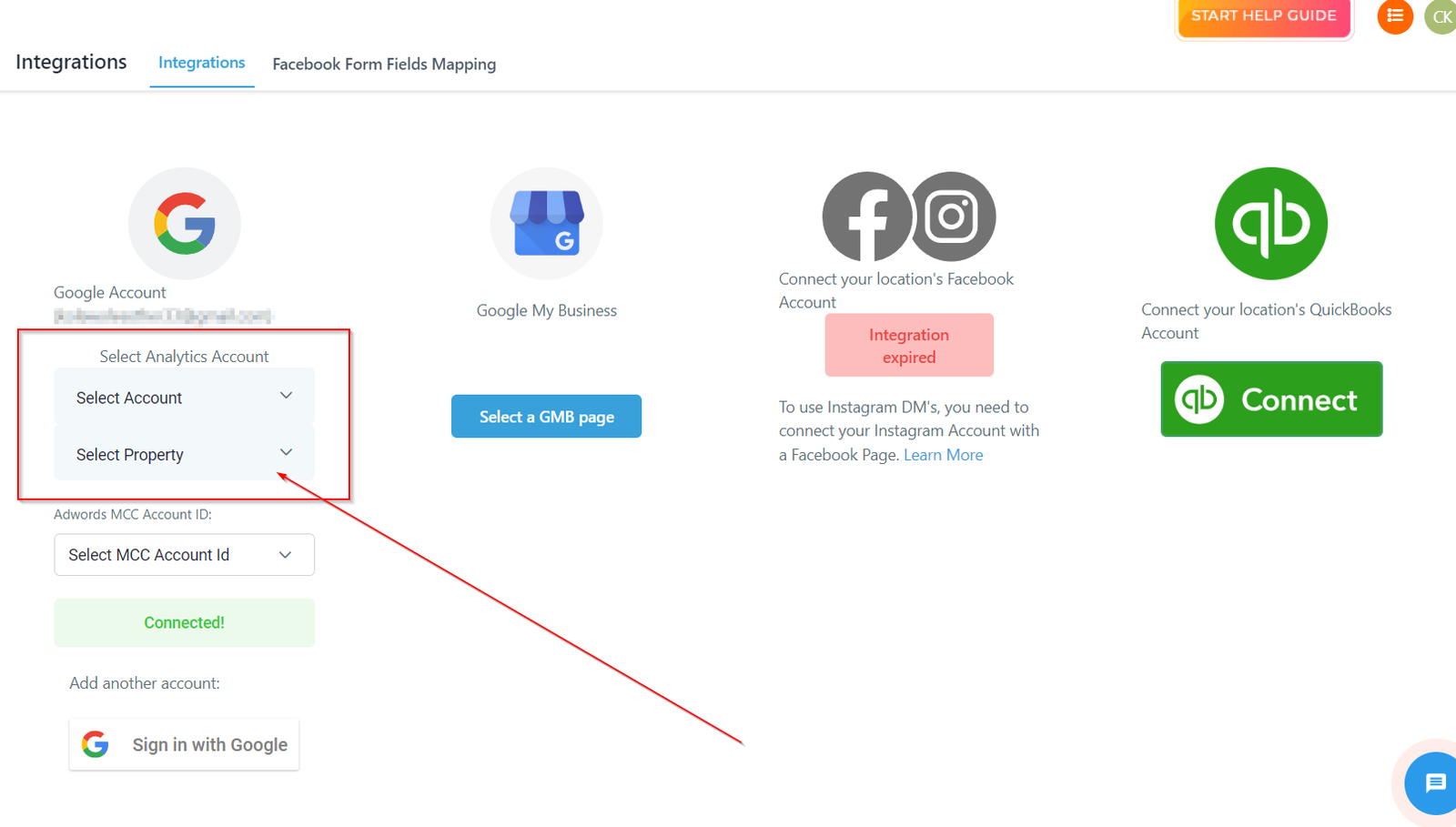 Connecting your Google accounts will give you the ability to manage and view different Google products inside of your CRM including Gmail SMTP (Google Workspace), Google My Business, Google Ads, and Google Analytics.