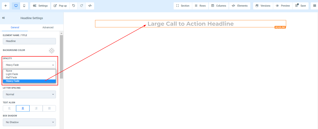 You can decide the extent to which you want your text/content to fade in each element box. the opacity varies from None, Light, Half, to Heavy fade.