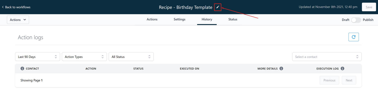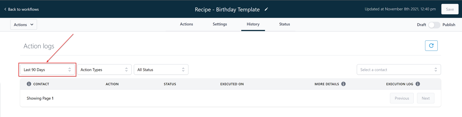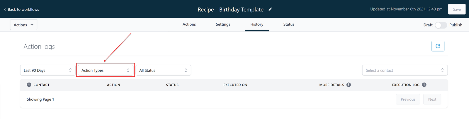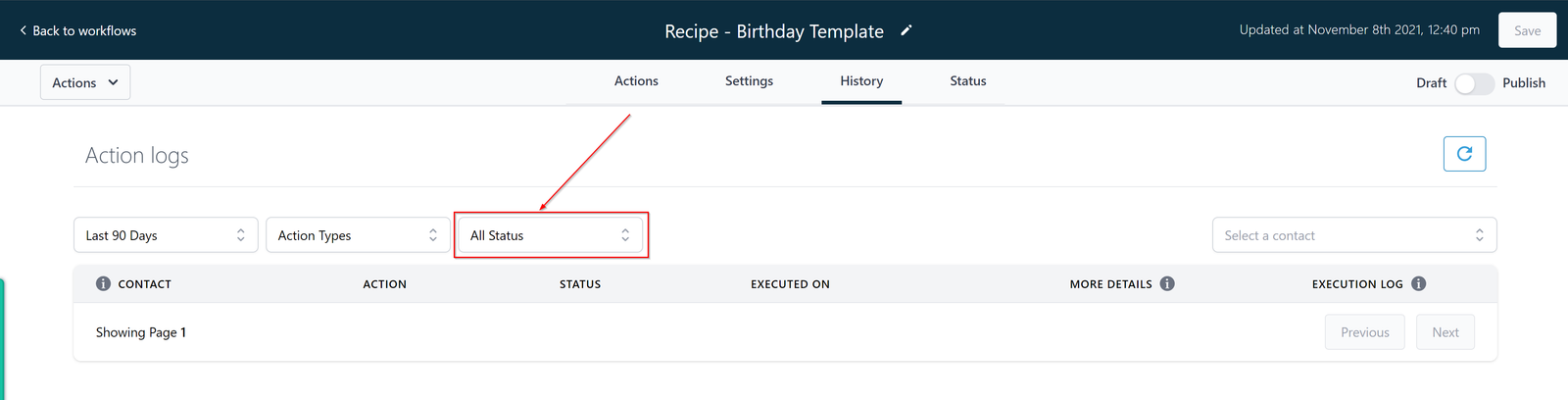 You can filter your action logs list by status by clicking here.